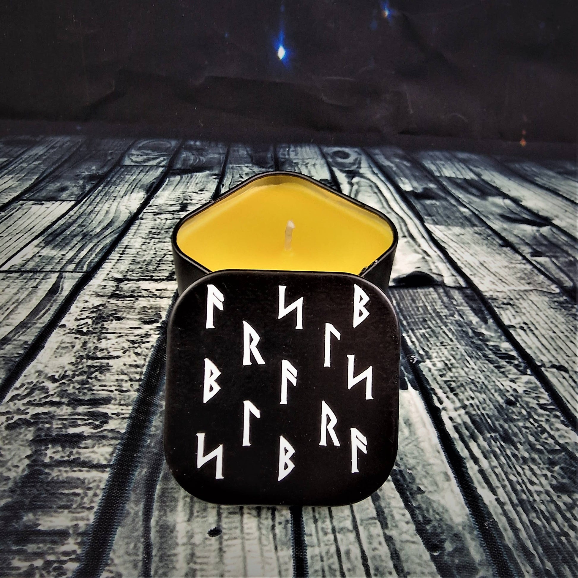 Our Freya's Tears hand made candle tins are scented with a delicate floral scent with a hint of musk, and coloured yellow gold to match the scent and colour of our Freya rune wax melts.